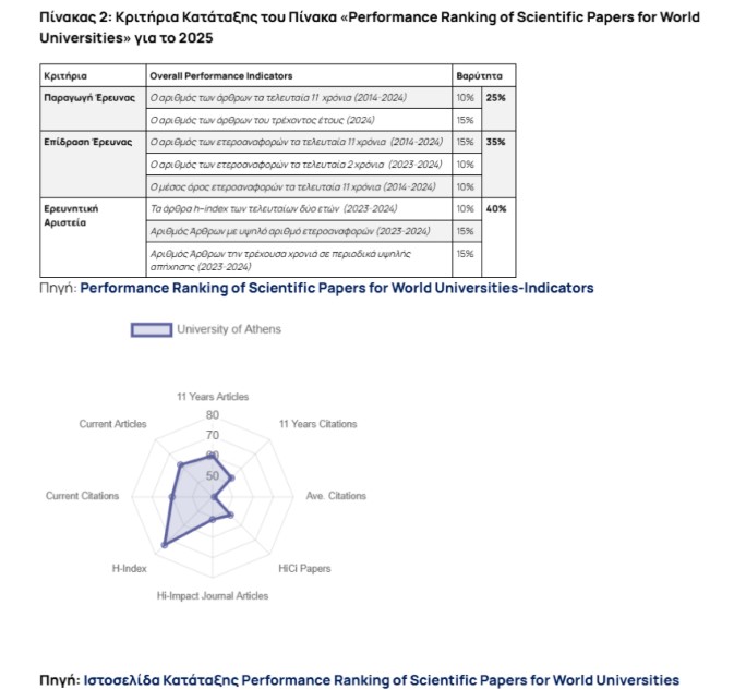 Τα κριτήρια αξιολόγησης για το 2025 περιλαμβάνουν οκτώ (8) δείκτες. Αυτοί οι δείκτες αντιπροσωπεύουν και ενσωματώνουν τρία διαφορετικά κριτήρια απόδοσης των επιστημονικών δημοσιεύσεων: την παραγωγικότητα της έρευνας, τον αντίκτυπο της έρευνας και την αριστεία της έρευνας. Ο Πίνακας 2 παρουσιάζει τους δείκτες αξιολόγησης και τις αντίστοιχες σταθμίσεις για κάθε δείκτη.