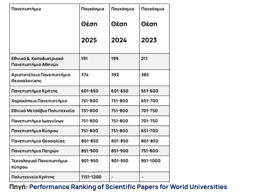Την 191η θέση στον κόσμο καταλαμβάνει για το 2025 το Εθνικό και Καποδιστριακό Πανεπιστήμιο Αθηνών, σύμφωνα με τον διεθνώς αναγνωρισμένο πίνακα κατάταξης «Performance Ranking of Scientific Papers for World Universities». Πρόκειται για μία από τις πλέον σημαντικές παγκόσμιες κατατάξεις, η οποία βασίζεται και αξιολογεί την ποιότητα, ποσότητα και επιδραστικότητα του ερευνητικού έργου των Ιδρυμάτων παγκοσμίως. Με αυτή τη διάκριση το Πανεπιστήμιο Αθηνών γίνεται το μοναδικό ελληνικό πανεπιστήμιο που σπάει το φράγμα των top 200 Πανεπιστημίων σε μία από τις επτά διεθνώς αναγνωρισμένες και ευρύτατα αποδεκτές παγκόσμιες κατατάξεις συνολικής πολυκριτηριακής αξιολόγησης.