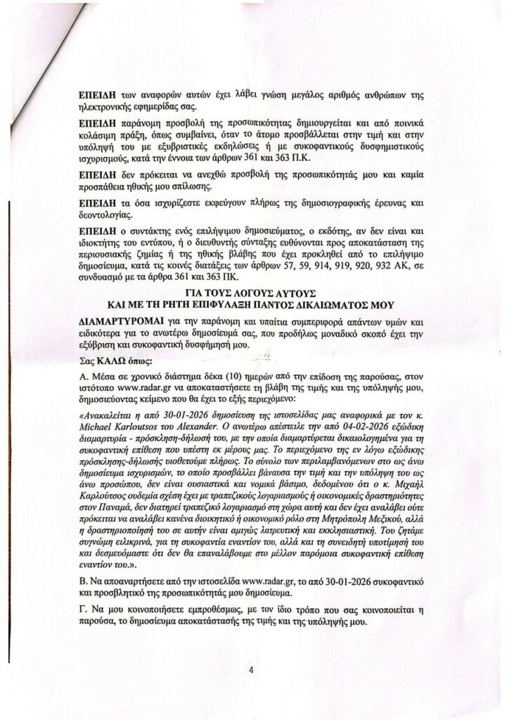 Δημοσιεύουμε αυτούσιο το εξώδικο του Μάικ Καρλούτσου προς το radar.gr, αναφορικά με το δημοσίευμα που φέρει τίτλο «Χειροτονείται διάκος ο γιος Καρλούτσου στο «φιλικό» Μεξικό – Από εκπρόσωπος της Hard Rock και πρώην υπεύθυνος πρωτοκόλλου στο Λευκό Οίκο, ο γιος του Father Alex, Μάικ ενδύεται το ράσο του ιερέα στον Παναμά, τον «παράδεισο» των οφ σορ εταιρειών», προς πλήρη ενημέρωση των αναγνωστών και στο πλαίσιο της τήρησης της δημοσιογραφικής δεοντολογίας.