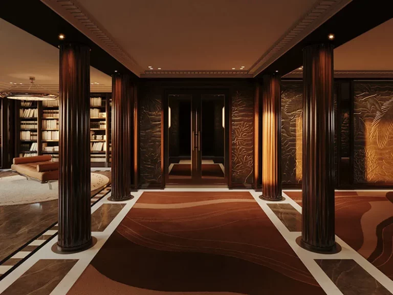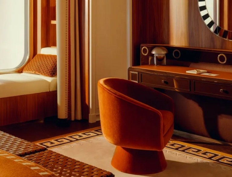 Οι εντυπωσιακοί εσωτερικοί χώροι φέρουν την υπογραφή του Maxime d’Angeac, αρχιτέκτονα και καλλιτεχνικού διευθυντή της Orient Express, που έχει στο portfolio του έργα όπως η μπουτίκ Guerlain στα Ηλύσια Πεδία και εμβληματικές κατοικίες στη Γαλλία, την Ελβετία και την Ιταλία.