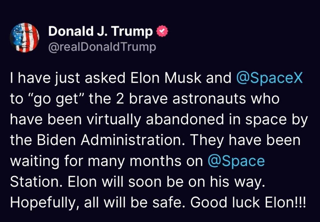 «Ο Έλον θα είναι καθ’ οδόν σύντομα. Με λίγη τύχη, όλοι θα είναι ασφαλείς. Καλή τύχη Έλον», ανέφερε μέσω Truth Social ο Ντόναλντ Τραμπ, προσθέτοντας τρία θαυμαστικά, αλλά χωρίς να ξεκαθαρίσει πότε προγραμματίζεται η εκτέλεση της αποστολής.