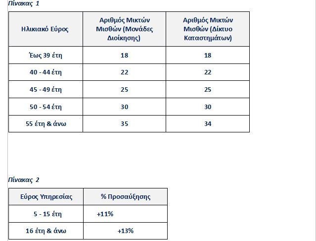 Στους Πίνακες 1 και 2, που ακολουθούν, εμφανίζεται ο αριθμός των μικτών μισθών (με βάση υπολογισμού το μικτό μηνιαίο μισθό του Ιανουαρίου 2023), που δικαιούται να λάβει ο εργαζόμενος, σύμφωνα με το εύρος ηλικίας του (με βάση υπολογισμού τα συμπληρωμένα έτη κατά την 31η Δεκεμβρίου 2023) και το αντίστοιχο ποσοστό προσαύξησης που προκύπτει από το εύρος υπηρεσίας στον Όμιλο (με βάση υπολογισμού τα συμπληρωμένα έτη υπηρεσίας κατά την 31η Δεκεμβρίου 2023).
