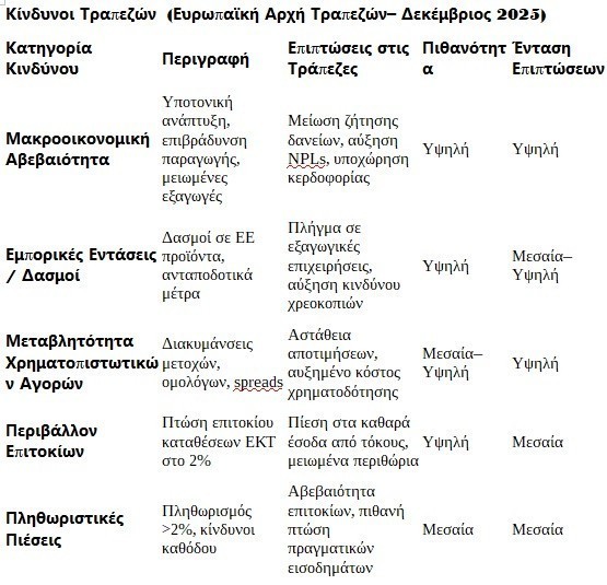 Η Ευρωπαϊκή Αρχή Τραπεζών στην έκθεση εκτίμησης κινδύνου Δεκεμβρίου 2025 εξετάζει το περίπλοκο και ασταθές οικονομικό περιβάλλον, στο οποίο οι τράπεζες καλούνται να λειτουργήσουν. Η ανάλυσή της εντοπίζει μια σειρά από παράγοντες που επηρεάζουν άμεσα και έμμεσα τη σταθερότητα, την κερδοφορία και την ανθεκτικότητα του τραπεζικού συστήματος. Οι κίνδυνοι αυτοί προέρχονται από γεωπολιτικές εντάσεις, εμπορικούς πολέμους, μεταβλητότητα στις χρηματοπιστωτικές αγορές, αλλά και από δημοσιονομικές πιέσεις και προκλήσεις στην αγορά ακινήτων.