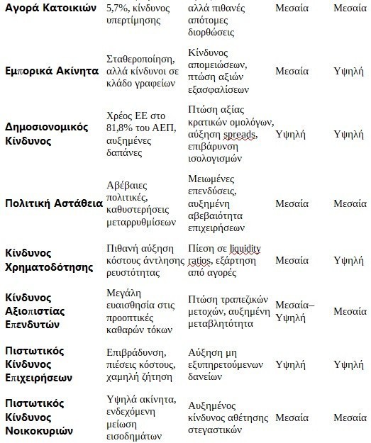 Οι τράπεζες είναι ιδιαίτερα ευάλωτες σε αρνητικές μεταβολές των spreads, στην αύξηση του κόστους χρηματοδότησης και στην πιθανή πτώση της αξίας των περιουσιακών στοιχείων που διακρατούν.