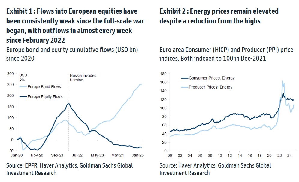 Συγκεκριμένα, η τράπεζα της Wall Street επισημαίνει ότι από την εισβολή της Ρωσίας στην Ουκρανία τον Φεβρουάριο του 2022, ο ευρωπαϊκός δείκτης μετοχών Stoxx 600 έχει υποαποδώσει κατά 13% και 6% έναντι του αμερικανικού δείκτη βαρόμετρο S&P 500 και του παγκόσμιου δείκτη μετοχών MSCI World.
