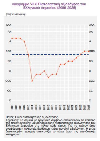 Κομβικό στοιχείο αυτής της εικόνας είναι η πλήρης ανάκτηση της επενδυτικής βαθμίδας. Όλοι οι μεγάλοι οίκοι που αναγνωρίζει το Ευρωσύστημα (Fitch, Moody’s, Morningstar DBRS, Scope Ratings και S&P) έχουν πλέον κρατική αξιολόγηση για την Ελλάδα εντός της επενδυτικής κατηγορίας. Μετά την αναβάθμιση της Scope στο τέλος του 2024 (από BBB- σε BBB), ακολούθησαν το 2025 η Morningstar DBRS (σε BBB από BBB (low)), η Moody’s (σε Baa3 από Ba1, ισοδύναμο του BBB- από BB+), η S&P τον Απρίλιο (σε BBB από BBB-) και η Fitch τον Νοέμβριο (σε BBB από BBB-), ενώ η Scope μετέβαλε τις προοπτικές σε θετικές. Οι οίκοι αποδίδουν την πρόοδο στους υψηλότερους των αναμενόμενων ρυθμούς ανάπτυξης, στην υπέρβαση των δημοσιονομικών στόχων και στη σημαντική μείωση του λόγου χρέους προς ΑΕΠ, υπογραμμίζοντας την ανθεκτικότητα της ελληνικής οικονομίας μέσα σε περιβάλλον διεθνούς αβεβαιότητας.