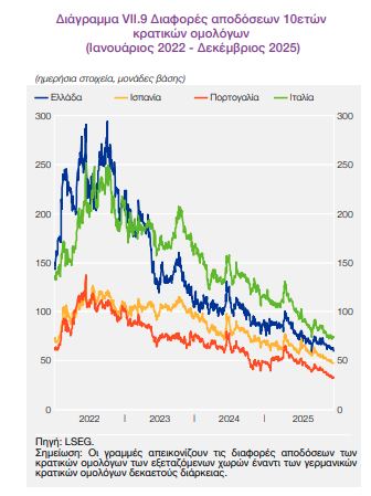 Οι αναβαθμίσεις αυτές έχουν ενεργοποιήσει σημαντικές ροές επενδυτικών κεφαλαίων προς την Ελλάδα. Στα κρατικά ομόλογα, οι θέσεις διεθνών επενδυτών αυξήθηκαν κατά 9,7 δισ. ευρώ από το α’ τρίμηνο του 2023 έως το β’ τρίμηνο του 2025. Η ενισχυμένη ζήτηση συνέβαλε στη συγκράτηση των αποδόσεων, παρά τις πιέσεις που προκάλεσαν εξελίξεις σε άλλες οικονομίες της ευρωζώνης, όπως η Γαλλία. Το spread του ελληνικού 10ετούς έναντι του γερμανικού διαμορφώθηκε στις 8.12.2025 στις 62 μονάδες βάσης, περίπου 135 μ.β. χαμηλότερα από τον μέσο όρο του α’ τριμήνου 2023, ενώ οι αποδόσεις των ελληνικών τίτλων παραμένουν χαμηλότερες από αντίστοιχα ομόλογα χωρών με συγκρίσιμη πιστοληπτική αξιολόγηση, όπως τα ιταλικά (spread 69 μ.β. την ίδια ημέρα).
