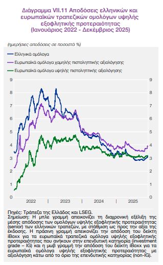 Οι αναβαθμίσεις αυτές συμπιέζουν αισθητά το κόστος χρηματοδότησης των τραπεζών από τις κεφαλαιαγορές. Οι αποδόσεις των ομολόγων υψηλής εξοφλητικής προτεραιότητας είναι πλέον χαμηλότερες από τις αντίστοιχες μεσοσταθμικές αποδόσεις ευρωπαϊκών τραπεζικών τίτλων με επενδυτική αξιολόγηση και έχουν μειωθεί κατά μέσο όρο κατά 17 μ.β. από την αρχή του 2025.