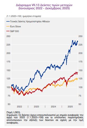 Μέσα σε αυτό το πλαίσιο, οι εισηγμένες στο Χρηματιστήριο Αθηνών εμφανίζουν ολοένα και πιο ενεργό ρόλο στην άντληση κεφαλαίων τόσο με μετοχικές όσο και με ομολογιακές εκδόσεις. Η αγορά μετοχών υπεραποδίδει διεθνώς: το 2025 οι αποδόσεις των ελληνικών μετοχών είναι σημαντικά υψηλότερες από τις ευρωπαϊκές και διεθνείς, με τον γενικό δείκτη να καταγράφει άνοδο 43,5% από την αρχή του έτους έως τις αρχές Δεκεμβρίου. Παρά την έντονη διεθνή αναταραχή, ιδιαίτερα τον Απρίλιο όταν οι τιμές στο ΧΑ υποχώρησαν σε συνάφεια με τις παγκόσμιες αγορές, η ελληνική αγορά ανέκαμψε γρήγορα, με αυξημένη μεταβλητότητα (ετησιοποιημένη μεταβλητότητα ημερήσιων αποδόσεων 1.1.-8.12.2025 στο 18,8%, αυξημένη κατά 4,2 ποσοστιαίες μονάδες σε σχέση με το 2024). Όλοι οι κλάδοι καταγράφουν θετικές αποδόσεις, με τις τραπεζικές μετοχές να λειτουργούν ως βασικός οδηγός της ανόδου.