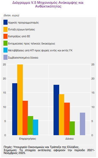 Μετά την εκταμίευση της 6ης δόσης των επιχορηγήσεων το Νοέμβριο του 2025, η Ελλάδα έχει λάβει συνολικά 23,4 δισεκ. ευρώ (65% των διαθέσιμων πόρων, έναντι 56% για το μέσο όρο της ΕΕ), εκ των οποίων 12 δισεκ. ευρώ σε επιχορηγήσεις (66% του συνόλου των επιχορηγήσεων) και 11,4 δισεκ. ευρώ σε δάνεια (64% του συνόλου των δανείων), 17 έχοντας ολοκληρώσει το 48% των συμφωνημένων στόχων/οροσήμων (έναντι 40% για το μέσο όρο της ΕΕ). Σχετικά με το δανειακό σκέλος του RRF, παρατηρείται επιβράδυνση στο ρυθμό αύξησης των συμβασιοποιήσεων των δανείων.