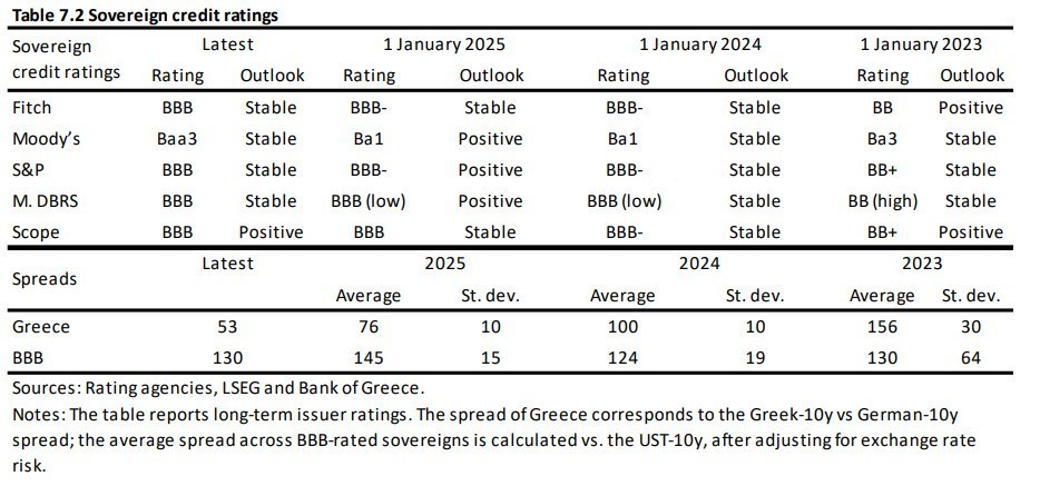 Η Ελλάδα αξιολογείται τώρα με BBB από τους οίκους S&P, Fitch, DBRS (όλοι με σταθερό outlook) και Scope Ratings (θετικό outlook), ενώ η Moody’s της έχει αποδώσει αξιολόγηση BBB-/Baa3.
