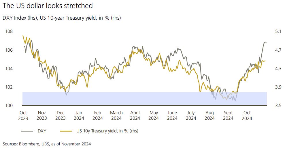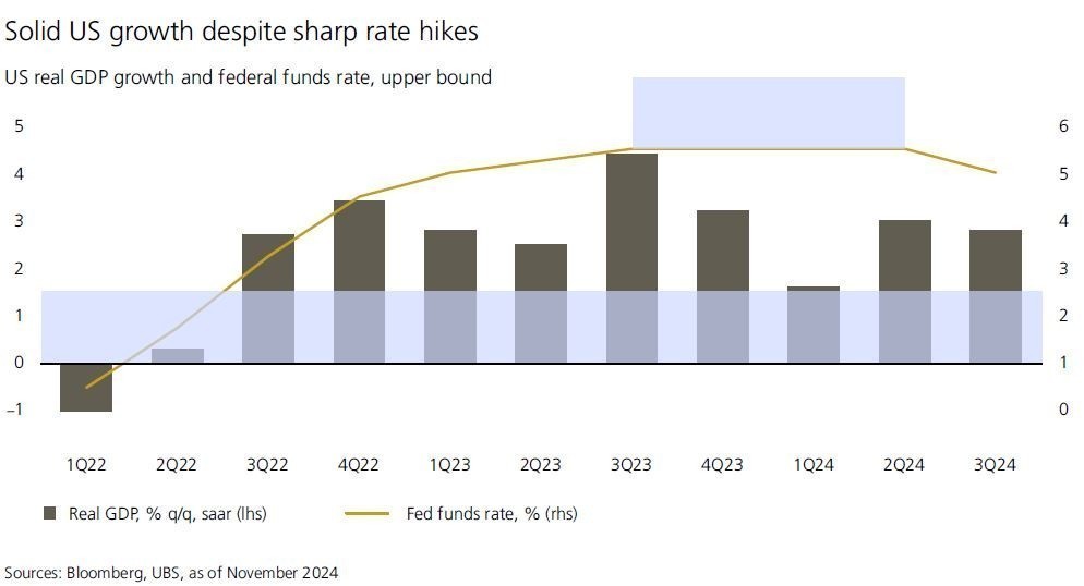 Ο Mark Haefele, Διευθυντής Επενδύσεων της UBS GWM, δηλώνει: «Το αποτέλεσμα των εκλογών στις Η.Π.Α. εξακολουθεί να αποτελεί σημείο εστίασης, με την προοπτική των χαμηλότερων φόρων και της απορρύθμισης να συνηγορεί υπέρ μιας θετικής εξέλιξης στην αγορά κατά τη διάρκεια της “ξέφρενης δεκαετίας του 2020”, η οποία βασίζεται στη σταθερή ανάπτυξη και τις συνεχιζόμενες επενδύσεις στην ΤΝ. Ωστόσο, τα προβλήματα της αποπαγκοσμιοποίησης, του χρέους και των δημογραφικών στοιχείων –μεταξύ άλλων– σημαίνουν ότι πρέπει να είμαστε προετοιμασμένοι για ευρύ φάσμα εκβάσεων κατά το επόμενο έτος».