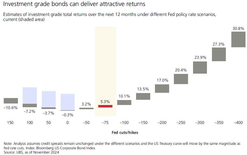 Τοποθέτηση για χαμηλότερα επιτόκια: Οι αποδόσεις των μετρητών θα μειωθούν υπό το πρίσμα των περαιτέρω μειώσεων των επιτοκίων από τις κεντρικές τράπεζες. Εν τω μεταξύ, τα ομόλογα επενδυτικού βαθμού προσφέρουν ελκυστικές αποδόσεις και δυνατότητες για κεφαλαιακά κέρδη, με τις συνολικές αναμενόμενες αποδόσεις να διαμορφώνονται σε μεσαίο μονοψήφιο ποσοστό σε δολάρια Η.Π.Α.
