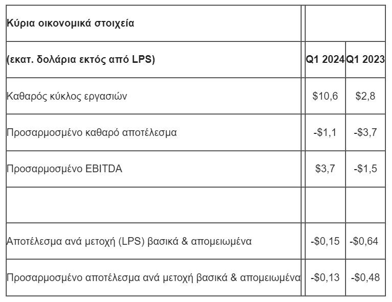 Κατά το πρώτο τρίμηνο του 2024, η Εταιρεία πραγματοποίησε καθαρό κύκλο εργασιών ύψους 10,6 εκατ. δολαρίων έναντι 2,8 εκατ. δολαρίων το πρώτο τρίμηνο του 2023. Οι καθαρές ζημιές και οι προσαρμοσμένες καθαρές ζημιές για το τρίμηνο ήταν 1,3 εκατ. και 1,1 εκατ. δολάρια, αντίστοιχα, σε σύγκριση με τις καθαρές ζημιές και τις προσαρμοσμένες καθαρές ζημιές ύψους 4,9 εκατ. και 3,7 εκατ. δολαρίων το πρώτο τρίμηνο του 2023.