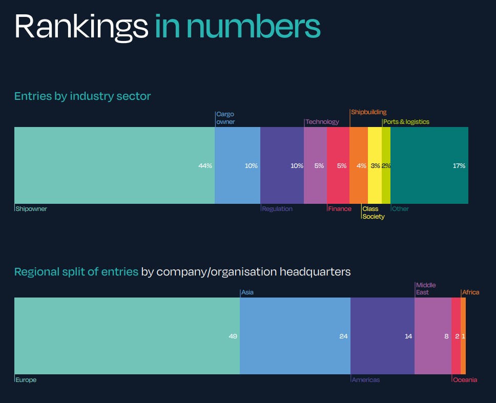 Σύμφωνα με τα infographics της Lloyd’s List, το 44% των 100 πιο επιδραστικών προσώπων προέρχεται άμεσα από τον χώρο της πλοιοκτησίας, ποσοστό μακράν υψηλότερο από οποιονδήποτε άλλο τομέα του κλάδου (χρηματοδότηση, τεχνολογία, ρυθμιστικές αρχές ή ναυπηγική) . Το στοιχείο αυτό εξηγεί γιατί χώρες με ισχυρή πλοιοκτησιακή παράδοση, όπως η Ελλάδα, εμφανίζονται διαχρονικά υπερεκπροσωπημένες.