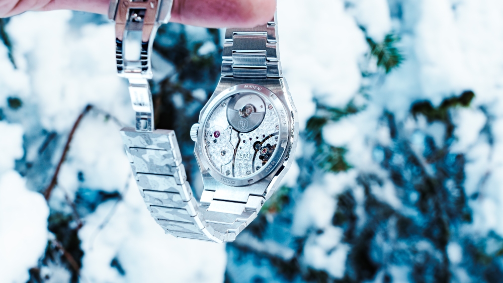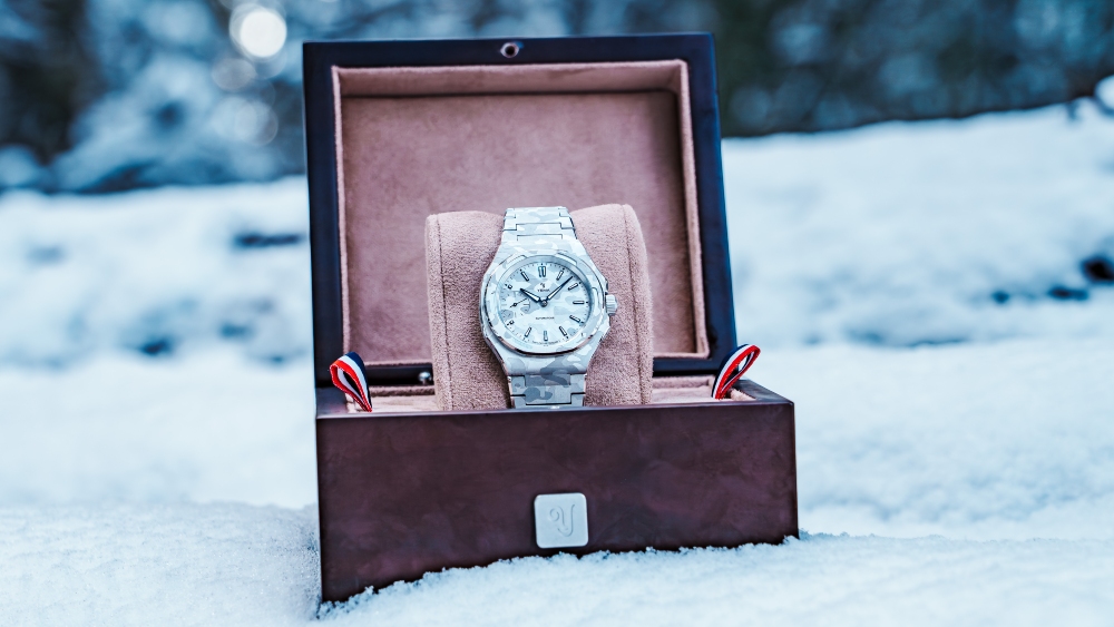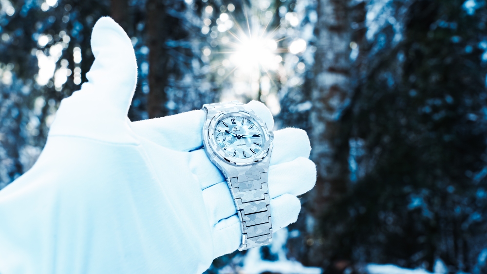 Η σειρά Wristmaster υπήρξε πάντα ένας καμβάς για τις πιο τολμηρές, ρετρο-φουτουριστικές σχεδιαστικές προτάσεις της Yema, αλλά αυτή η ειδική έκδοση ανεβάζει το επίπεδο ενσωμάτωσης σε νέα ύψη. Περιορισμένη σε μόλις 100 κομμάτια, το ρολόι φέρει το χαρακτηριστικό «snow camouflage», που έχει χαραχτεί με λέιζερ σε όλη την επιφάνεια του. Δεν πρόκειται απλώς για τυπωμένο καντράν. Η υφή ρέει ομαλά από το βουρτσισμένο στρατιωτικού στυλ καντράν στο ατσάλινο κουτί 39mm και συνεχίζει στο ενσωματωμένο μπρασελέ. Το αποτέλεσμα είναι μια stealthy μονοχρωματική παρουσία που μεταβάλλεται ανάλογα με τη γωνία του φωτός, δημιουργώντας ένα φαντασμαγορικό βάθος.