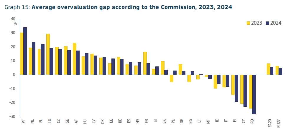 Ο ECFIN average overvaluation gap υπολογίζεται ως ο μέσος όρος αυτών των τριών δεικτών και στην περίπτωση της Ελλάδας δείχνει, όπως προαναφέρθηκε, υπερτίμηση κατά 25%.