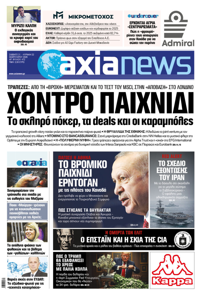 Το Μαξίμου σε γεωπολιτικό συναγερμό: Ο φόβος ενεργειακού σοκ, προσφυγικών ροών και τουρκικής αναβάθμισης σε περίπτωση αμερικανικής επέμβασης στο Ιράν | Μυστική διπλωματική σκακιέρα πριν από το ΝΑΤΟ: Η αιφνιδιαστική κάθοδος Τραμπ στην Αθήνα και το μήνυμα από την Πνύκα με αποδέκτη την Άγκυρα | Ινδικό κεφάλαιο 3 δισ. στον ελληνικό πρωτογενή τομέα: Αγορές γης, μηδενισμός δασμών και νέα εξαγωγική αρχιτεκτονική | Ακίνητα, Χρυσή Βίζα και βουλγαρικές «βιτρίνες»: Η αθόρυβη διείσδυση τουρκικών κεφαλαίων στη Βόρεια Ελλάδα και ο συναγερμός των υπηρεσιών | Στρατηγική αναμονής με φόντο την ήττα: Η σιωπηλή στήριξη Γερουλάνου στον Ανδρουλάκη και το ρίσκο της επόμενης μέρας για το ΠΑΣΟΚ-ΚΙΝΑΛ | Ο Πέτσας τραβά διακριτικές γραμμές απέναντι στη σύγκρουση με Κωνσταντοπούλου και στέλνει μήνυμα εσωκομματικής ισορροπίας στον Μητσοτάκη, με φόντο τις πρόωρες ζυμώσεις και τη σκιά Σαμαρά – Καραμανλή | Η επίθεση Ντικούδη στον Παπαθεοδώρου, το φιάσκο του «All Around» και η αμηχανία του εκδότη μπροστά στις απογοητευτικές πωλήσεις