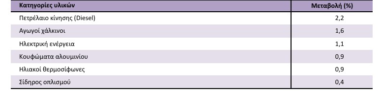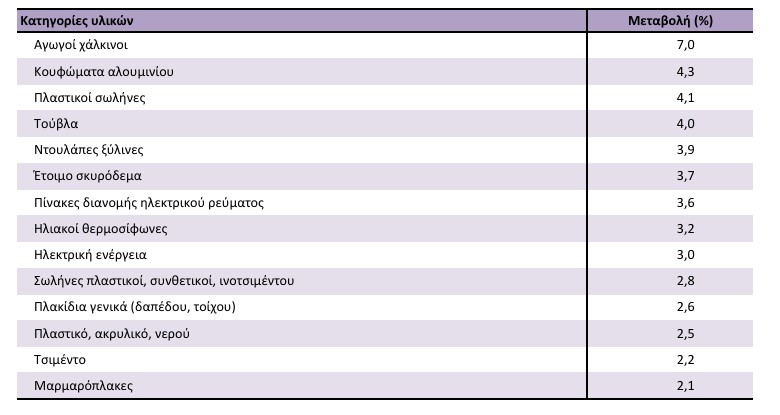 Ο Γενικός Δείκτης Τιμών Υλικών Κατασκευής Νέων Κτηρίων Κατοικιών τον μήνα Φεβρουάριο2026,σε σύγκριση με τον αντίστοιχο δείκτη του Ιανουαρίου2026, παρουσίασε αύξηση 0,4% Οι κυριότερες μεταβολές των επιμέρους δεικτών τιμών κατηγοριών υλικών ήταν οι ακόλουθες.